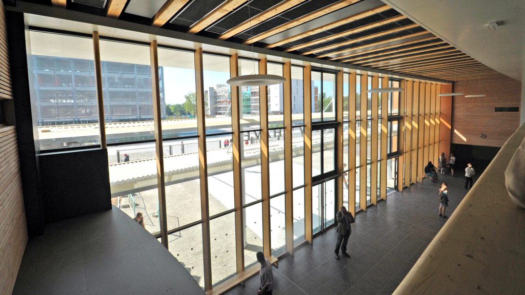 Près de Bordeaux, le lycée de Bègles est le premier à énergie positive en France. Une performance à laquelle ont largement contribué les solutions Bois et Bois-Alu de Bieber, développées sur 1 150 m2 de surfaces vitrées. Ce projet hors normes de près de 16 000 m² est l’un des plus grands chantiers réalisés par les menuiseries Bieber avec près de 956 châssis en bois ou en mixte posés pour ce lycée et ses structures. De la fenêtre de désenfumage, au mur rideaux notre challenge était de pouvoir répondre au différentes contraintes techniques et architecturales souhaités par ce bâtiment.